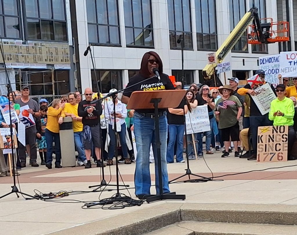 Trina Robinson, President of the Community Forum for Economic Justice, and President of the South Bend NAACP, speaking at the No Kings Rally, October 18, 2025